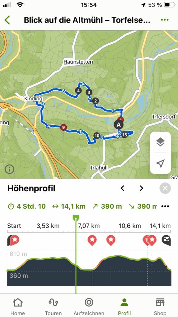 Nach langer Fahrt gestern sind wir nun hier angekommen – in Töging, einem Ortsteil von Dietfurt an der Altmühl, unserem Zwischenhalt auf unserem Weg nach Kleinarl in Österreich. Heute haben wir die Gegend erkundet – als Einstieg in unseren Wanderurlaub natürlich mit einer Wanderung hier in der Umgebung, ca. 15 km lang. Unser Weg führte uns von unserem Startpunkt Unteremmendorf über die Berghänge nördlich der Altmühl bis in den kleinen Ort Kinding und von dort aus südlich der Altmühl zurück nach Unteremmendorf. In Kindig haben wir in einem bayrischen Wirtshaus eine kurze Rast eingelegt. Da wir keine Schweinehaxe essen wollten (an den Nachbartischen wurden solch deftige Fleischberge durchaus mit Freude verspeist) haben wir blauäugig Eiskaffee bzw. einen kleinen Eisbecher bestellt – keine so gute Idee in Bayern. Der Eiskaffee schmeckte recht deutlich nach Schweinehaxe – aber was hatten wir eigentlich anderes erwartet?