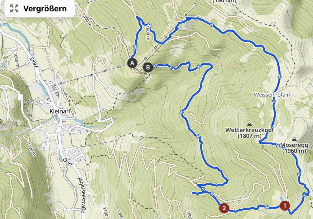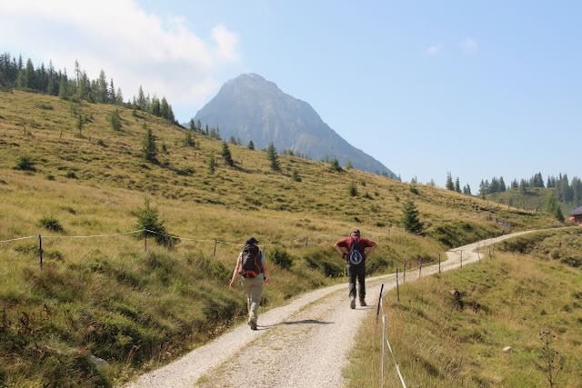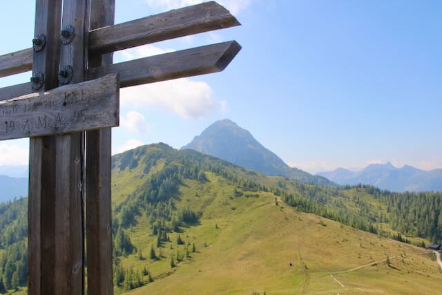 Mit der Anmietung der Ferienwohnung haben wir eine Art Ferienkarte erhalten, mit der wir ausgewählte Bergbahnen in der Umgebung kostenlos nutzen können. Das haben wir heute in Anspruch genommen und sind mit dem „Champion Shuttel“ – einem Sessellift – bis zur Bergstation gefahren. Von dort aus sind wir losgelaufen. In einer ca. 4 stündigen Wanderung haben wir den Wetterkreuzkopf umrundet, lange mit einem wunderschönen Blick auf den imposant aufragenden „Ennskraxen“ (2410 m). Auch wenn wir diesen Gipfel nicht erstiegen haben, war es heute sehr anstrengend. Die Temperaturen sind auch hier hochsommerlich warm. Umso schöner war dann die entspannte Rückfahrt mit dem Sessellift – quasi schwebend über dem Berghang.